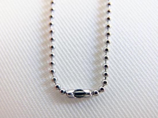 チェーンはカジュアルなステンレス製のボールチェーン。長さがあるのでかぶって使うことができて、着脱も簡単です。