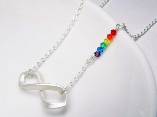 インフィニティ(∞)のチャームにさりげなくレインボーカラーのスワロフスキー・クリスタルを添えた、繊細な印象のネックレス。